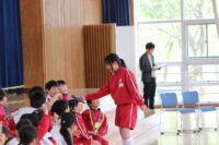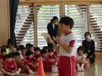その次に、消防署に方から消火器の使い方を教わりました。代表児童が実際に消火器を使って水を出す体験をし、全校児童がその様子を見て消火器の使い方を学んでいました。
