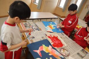 3年生 巨大紙風船づくり 2026年1月16日 3年生, たんぽぽ・ひまわり・すみれ・すまいる 本校では、毎年2月に福光道の駅で開催される「南砺ふくみつ雪あかり祭り」に、3年生が巨大紙風船を作成して出品しています。 先日から下絵を描いていたものに、本日、絵具で色を塗りました。 子供たちは、全員で声をかけ合いながら、楽しく塗り進めていました。 当日、高く上がる紙風船が見られるのを、子供たちも楽しみにしています。