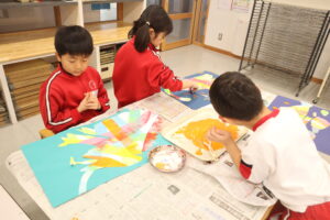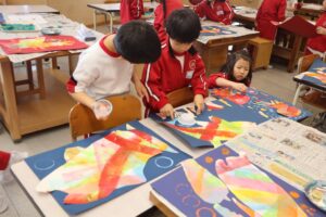 1年生 わくわく生きものランド(図画工作) 2026年1月16日 1年生, たんぽぽ・ひまわり・すみれ・すまいる, 未分類 1年生は、12月にローラーで色を付けた紙を、思い思いの形に切って画用紙に貼りました。 海の中の生きものや、草むらの中の生きもの、太陽に照らされた大地の生きものなど、自分のイメージを膨らませていました。 子供たちのすてきな感性あふれる作品が仕上がりました。