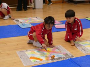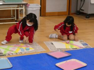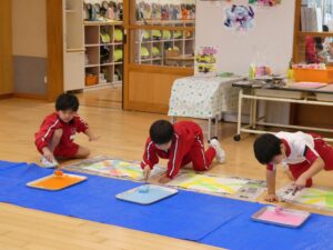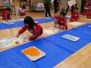 今日は、カラフルな色を使ってローラーで色着けをしました。「虹のように並べて色を着けよう」「波のように丸くローラーを動かそう」「黄色と水色を重ねてみよう」など、子供たちは思い思いにローラーを動かしていました。