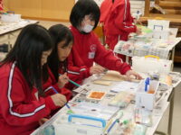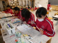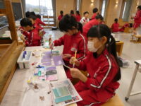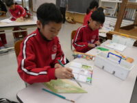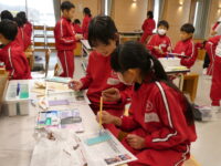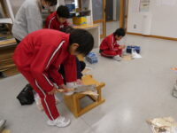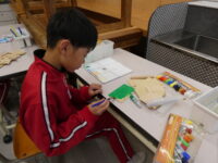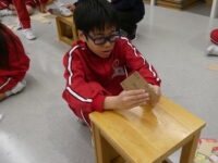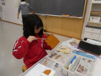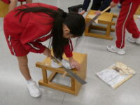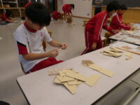 4年生の図工では、ベニヤ板や木の角柱をのこぎりで切り、それらを組み合わせて作品を作っています。