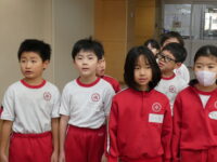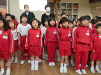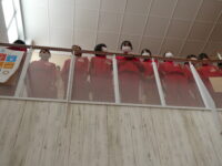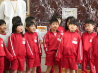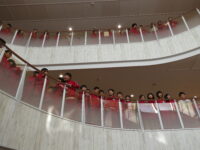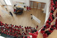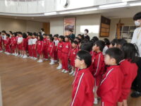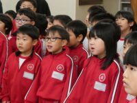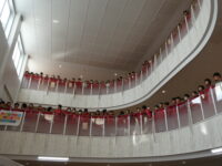 全校児童が集まり、吹き抜けの空間を使って「歌声集会」を行いました。