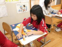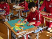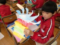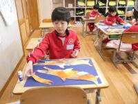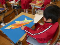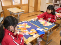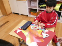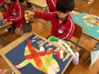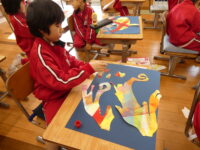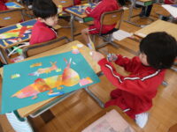 1年生は、12月にローラーで色を付けた紙を、思い思いの形に切って画用紙に貼りました。