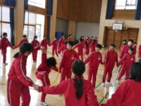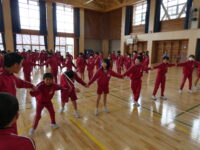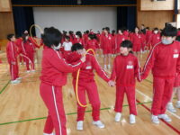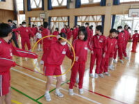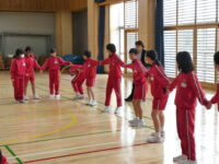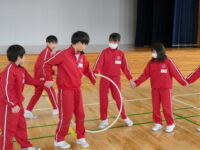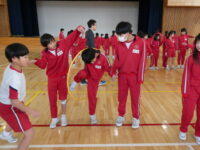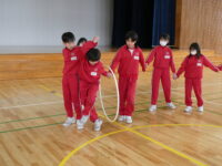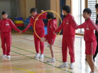 4年生と6年生が4つの混合チームに分かれ、手をつないでフラフープを移動させる『フラフープリレー』を行いました。