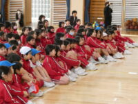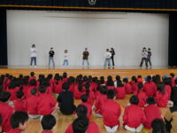 多くの子供たちが体育館に集まり、音楽に合わせて手拍子をしながら楽しい時間を過ごしました。