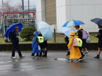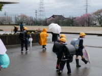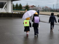 今日は集団下校。小雨の中、通学班長や先生と一緒に下校をしました。