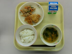 魚のスタミナ揚げ 茎わかめのサラダ じゃがいものみそ汁