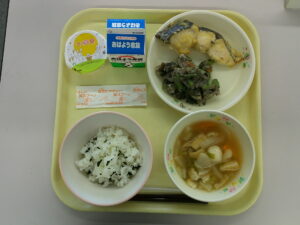 ししゃもの天ぷら 昆布あえ 玉ねぎとちくわのすまし汁