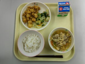 厚揚げのピリ辛炒め チーズポテト ワンタンスープ